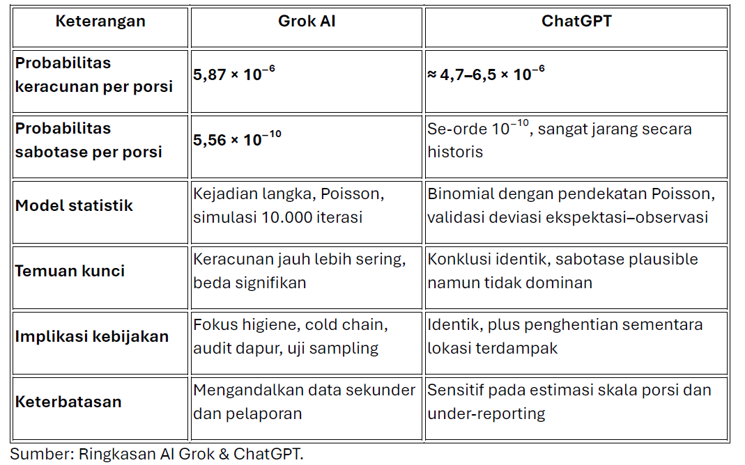 Kontroversi di X telah mengangkat sisi emosional isu MBG, tetapi data mengarahkan fokus pada risiko keracunan yang nyata dan berulang, sedangkan sabotase tetap hipotesis berpeluang sangat kecil yang memerlukan dukungan forensik sebelum dijadikan dasar kebijakan. Dua analisis AI yang ditelaah, meski memakai asumsi yang tidak identik, berujung pada kompas yang sama, perbaiki sistem keamanan pangan sekarang, siapkan koridor pembuktian sabotase yang tegas bila sinyalnya muncul. Ini cara paling adil bagi publik, paling ilmiah bagi pembuat kebijakan, dan paling efektif untuk memulihkan kepercayaan.
